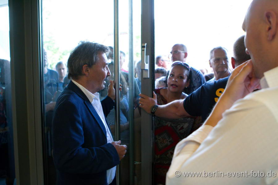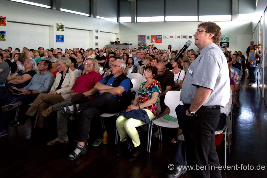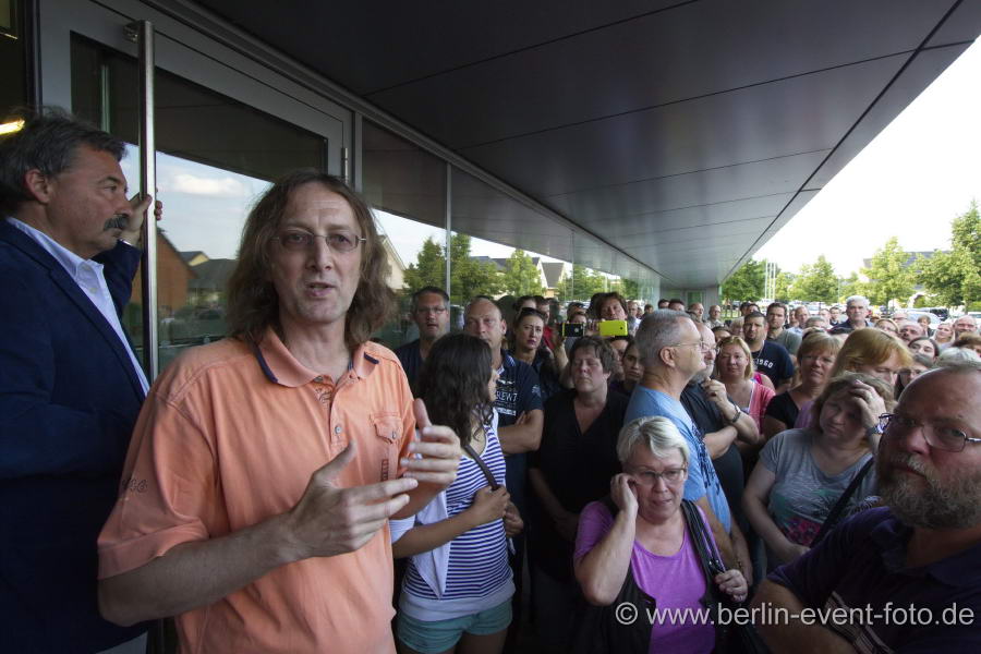 Da die Aula des Marie-Curie-Gymnasiums mit gut 200 Plätzen schon vor der Veranstaltung gefüllt war, mussten die anderen Besucher zunächst draußen bleiben. Nach 90 Minuten gab es dann eine zweite Veranstaltung mit dem gleichen Vortrag. Dagegen gab es zunächst Unmut, die Bürger skandierten „Wir wollen rein!“. Aber dem Bürgermeister gelang es, die Gemüter zu beruhigen und er beantwortete geduldig die Fragen.