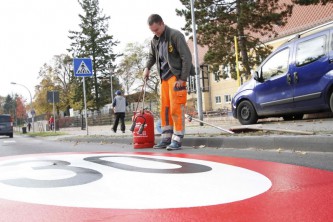 Die Fahrbahnmarkierungen „Tempo 30“ machen verstärkt auf die Tempobegrenzung aufmerksam.