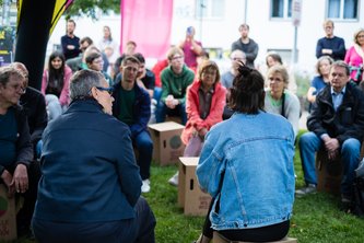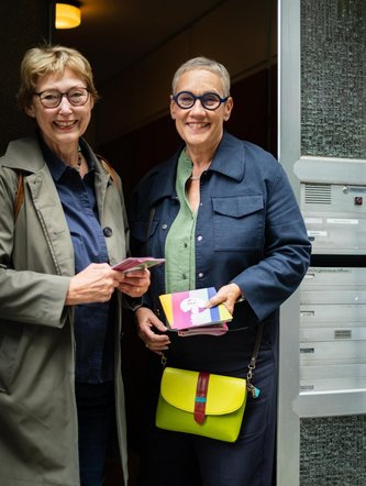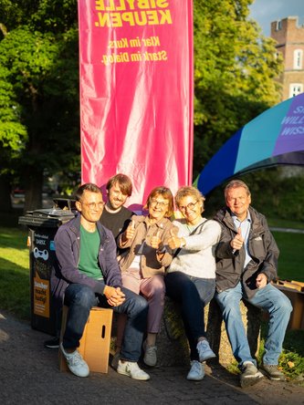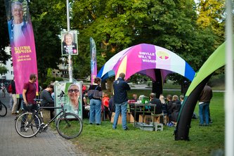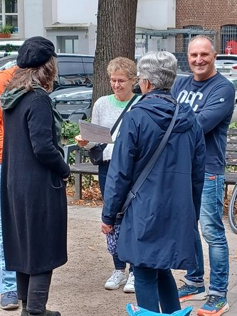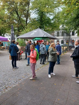 Nach einer kurzen Mittagspause trafen wir uns dann mit vielen anderen Grünen erneut in einem nahen Park. Von dort aus ging es in diversen kleinen Gruppen, inklusive der jeweiligen Wahlkreiskandidat*Innen, in den Haustürwahlkampf. Und so klopften wir an ganz viele Türen, bewältigten eine Vielzahl von Treppen und hatten dabei zahlreiche sehr positive Gespräche - bis unsere Beine uns um eine Pause baten.