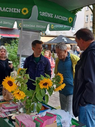 Am Samstag starteten wir dann auch direkt rein: Gemeinsam mit ihnen und ihrem Bundestagsabgeordneten Lukas Brenner machten wir bis zum Mittag über Standwahlkampf auf dem Markt im Frankenviertel im Aachener Zentrum. Dabei kamen wir mit zahlreichen Anwohner*innen in sehr positive Gespräche und konnten viele Unterschriften für eine lokale Initiative der Bündnisgrünen für besseren Hitzeschutz in der Stadt sammeln.
