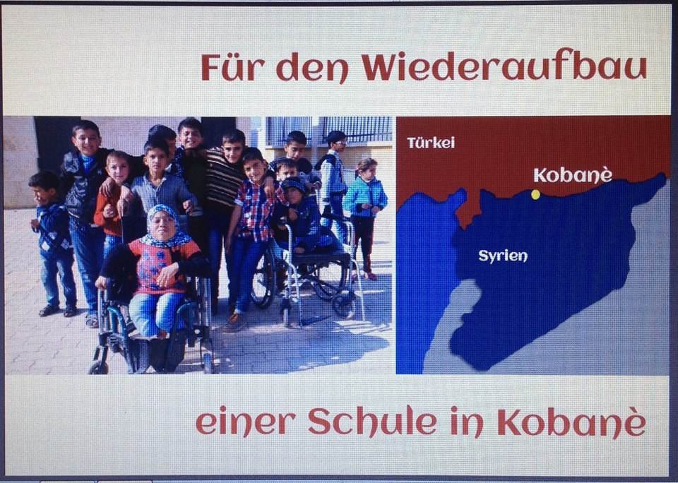 Um den Kindern von Kobanè eine Perspektive zu geben, werden wir nach Kräften den Aufbau einer Schule in der weitgehend zerstörten Stadt unterstützen. Unserer Hoffnung auf einen zivilen Aufbau verleihen wir durch dieses Vorhaben Ausdruck. Kobanè war nicht allein in den schrecklichen Tagen des Kampfes und wird von uns nicht allein gelassen, wenn es an den Wiederaufbau geht. ... "