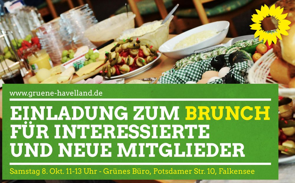 Bündnis 90/Die Günen möchten euch gern zum gemütlichen Brunch am Samstag, den 8. Oktober um 11 Uhr im Grünen Büro, Potsdamer Str. 10 in Falkensee einladen. In den letzten Jahren ist der Güne Kreisverband Havelland schnell gewachsen, Grüne Politik und Themen interessieren immer mehr Havelländer. An diese Entwicklung möchten wir auch in den nächsten Jahren und mit Blick auf die Bundestagswahl 2017 anknüpfen.