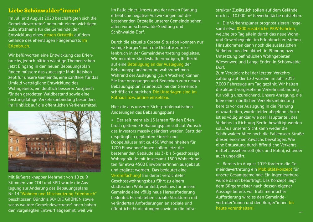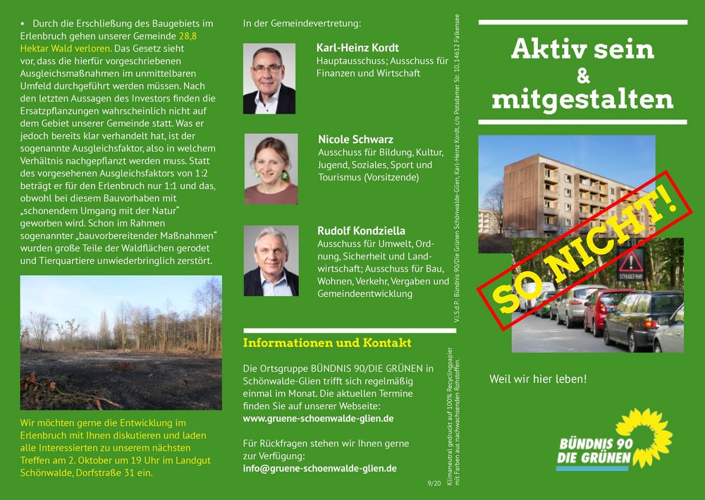Wir möchten gerne die Entwicklung auf dem Gelände des ehemaligen Fliegerhorst im Erlenbruch mit Ihnen diskutieren und laden alle Interessierten zu unserem nächsten Treffen am 2. Oktober um 19 Uhr im Landgut Schönwalde, Dorfstraße 31 ein. Um die Veranstaltung pandemie-konform umsetzen zu können müssen wir die Zahl der Teilnehmenden auf 50 Personen begrenzen. Wir bitten daher um vorherige Anmeldung unter: Opens window for sending emailinfo@gruene-schoenwalde-glien.de. Selbstverständlich sind auch spontan Interessierte herzlich Willkommen. Jedoch können wir den Einlass aufgrund der Teilnehmer*innengrenze von 50 nicht garantieren. Schauen Sie sich dazu gerne die Bilder unseres aktuellen Flyers oder die angehängte PDF-Datei an.