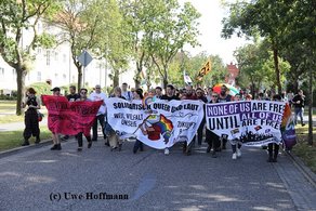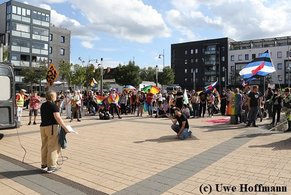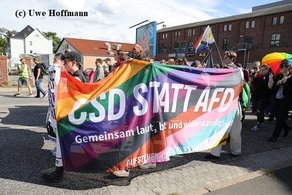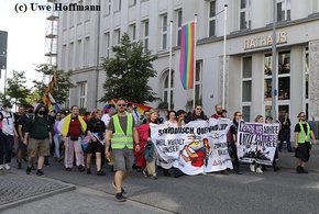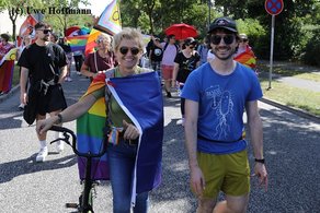 „Rathenow bleibt bunt“, begrüßte Versammlungsleiter und KiJuPa-Co-Vorsitzender Dennis Driebusch die Teilnehmer. „Wir lassen uns die Straße nicht von den Rechten nehmen!“ rief KiJuPa-Mitglied Steve den Teilnehmer*innen, die auch Banner wie „CSD statt AfD“ mit sich trugen, zu und zitierte das Grundgesetz: „Die Menschenwürde ist unantastbar.“ Steve nahm in diesem Jahr an mehreren CSD-Paraden in Brandenburg, aber auch benachbarten Bundesländern teil. Der bunte Rathenower Demozug führte vom Hauptbahnhof, durch Rathenows Innenstadt und endete dieses Mal, nach rund 90 Minuten, auf dem „Rideplatz“. Die Demo wurde durch die Polizei abgesichert, verlief aber, bis auf wenige „Beobachter“, sehr friedlich und ohne Störungen. Am Rathaus vorbei grüßte die gehisste Regenbogenflagge. In Rathenow gab es kein Problem für diese solidarische Unterstützung.