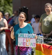 Die Redner*innen betonten, dass die Regenbogenfahne nicht nur ein Stück Stoff, sondern vielmehr ein Symbol der Freiheit, der Gleichheit und Akzeptanz aller Menschen sei. Ein Angriff auf dieses Symbol sei auch ein Angriff auf die Grundwerte unserer Gesellschaft. Die stellvertretende Bürgermeisterin und Gleichstellungsbeauftragte Frau Mattausch betonte in ihrer Rede, dass sich die Stadt für ein diskriminierungsfreies Miteinander einsetze. „Man kann zwar eine andere Meinung haben, aber dies ist auf keinen Fall ein Grund die Regenbogenfahne anzuzünden oder zu schänden.“