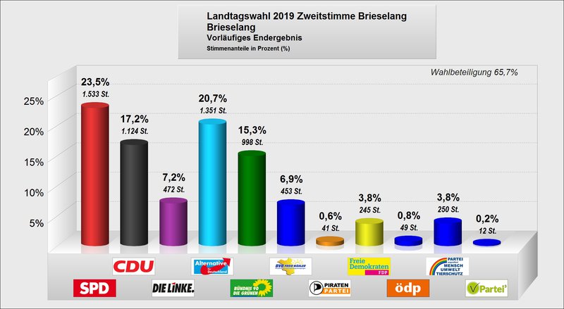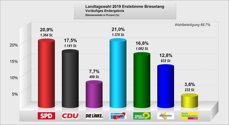 Zur Landtagswahl gibt es aus Brieselang heute gleich drei gute Nachrichten zu vermelden: Zum einen stieg die Wahlbeteiligung im Ort im Vergleich zur letzten Landtagswahl um 18,7 Prozentpunkte auf 65,7%. Vor allem aber freut uns, dass wir unser Wahlergebnis bei den Erststimmen für unsere Direktkandidatin Petra Budke um 7,2 Prozentpunkte auf 16,6 Prozent und bei den Zweitstimmen um 5,8 Prozentpunkte auf 15,3 Prozent erhöhen konnten. Oder anders formuliert: Im Vergleich zur Landtagswahl 2014 konnten wir unglaubliche 591 Wähler*innen hinzugewinnen!