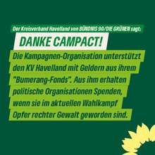 „Im bisherigen Wahlkampf wurden viele unserer Großflächen und auch Laternenplakate zerstört oder beschmiert. Zudem gab es wiederholt Versuche unsere ehrenamtlichen Wahlkämpfer*innen einzuschüchtern. Das entsetzt uns sehr. Aber davon lassen wir uns nicht unterkriegen. Daher haben wir uns um Mittel aus dem Bumerang-Fonds von „Campact“ beworben. Wir freuen uns sehr, dass wir davon welche erhalten. Sobald diese dann auch eingetroffen sind, nutzen wir die Spenden um die Betroffenen zu unterstützen und um weiter Werbematerial für die Wahl zu produzieren und um es noch vor dem Wahltag zu verteilen. Mit Blick auf den 9. Juni rufen wir alle Havelländer*innen dazu auf, demokratisch zu wählen“