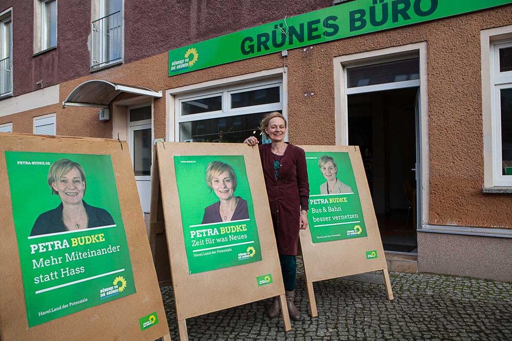 Unter dem Motto "Zeit für was Neues" hat die Kandidatin von Bündnis 90/Die Grünen Petra Budke am 23.02. in Falkensee ihr Programm und die Plakate für die Landrätinwahl vorgestellt.