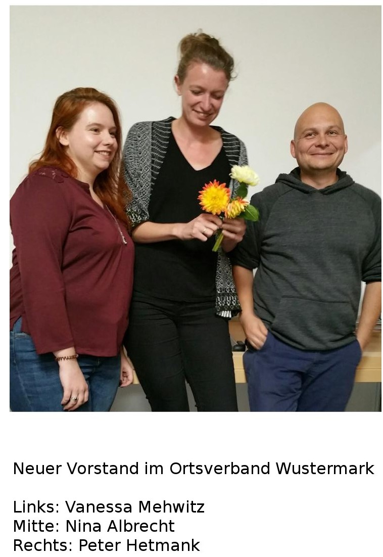 Der Grüne Ortsverband in Wustermark hat am 10. Oktober einstimmig einen neuen Vorstand gewählt: Nina Albrecht, Vanessa Mehwitz und Peter Hetmank. Gemeinsam mit allen Wustermarker Grünen sowie interessierten, parteilosen Bürgerinnen und Bürgern wollen die drei Wustermarker die bisherige erfolgreiche Arbeit fortführen. So geht zum Beispiel der Wustermarker Ausgleichsflächenpool auf eine aktuelle Initiative der Wustermarker Grünen zurück. Durch diesen Flächenpool müssen Investoren, die in Wustermark bauen, die verlorene Naturfläche ausgleichen. Es ist bereits eine für das Ökosystem sehr wertvolle Streuobstwiese entstanden, weitere Projekte sind in der Planung.