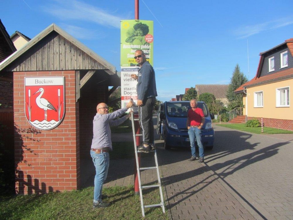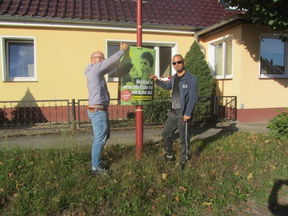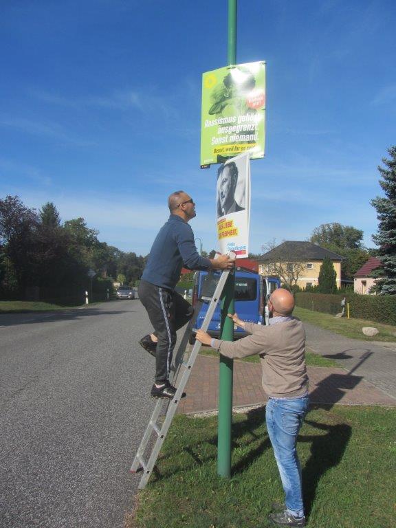 Am Freitag, dem 01.10.21, war das Abhänge-Team im fernen Westhavelland unterwegs. Es galt, alle grünen Plakate in den Dörfern des Amtes Nennhausen und in der Gemeinde Milower Land wieder von den Laternen zu holen. Und es war eine erfolgreiche Aktion, denn alles klappte gut und zügig. Es waren nicht mehr alle Plakate da. In Bahnitz fanden wir nur noch zwei von fünf vor. In Nennhausen fehlte auch das am Bahnhof nachgehängte Plakat schon wieder – heruntergerissen. Auf dem Wertstoffhof Bölkershof bei Rathenow konnten wir dann gleich alle Plakate loswerden. Sehr gut: Unsere Plakate sind, anders als die der meisten politischen Mitbewerber, aus recycelbarer Pappe – also kein Restmüll! Es war ein sehr langer Tag im Westhavelland: Es wurde zwar abgehängt, gechillt wurde aber nicht.