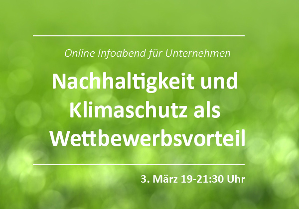 Die Taskforce Klimaschutz Falkensee lädt am Donnerstag, dem 3. März 2022, von 19-21:30 Uhr zum Online-Infoabend „Nachhaltigkeit und Klimaschutz als Wettbewerbsvorteil“ ein.